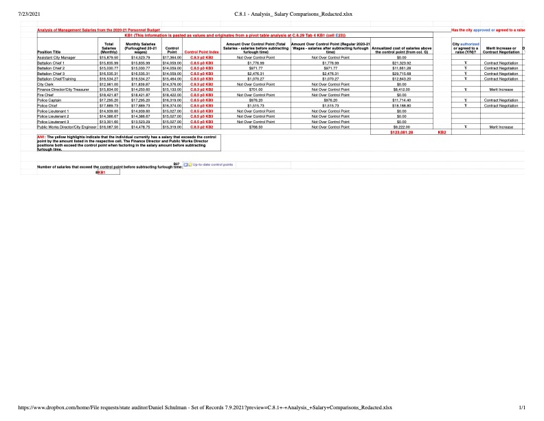 The auditor analyzed El Cerrito’s 2020-21 personnel budget and identified eight individuals whose salaries currently exceed the city’s control point before factoring in furlough days that two of those employees have. The auditor estimated that the total annual cost of these salaries is approximately $123,000.”