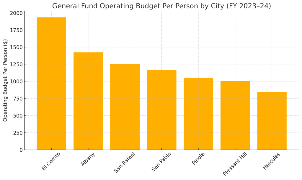 While public safety is always a top priority, El Cerrito’s combined police and fire budget—totaling nearly $28 million—exceeds the entire General Fund of cities like Pinole and Hercules, each of which serves a comparable or larger population.