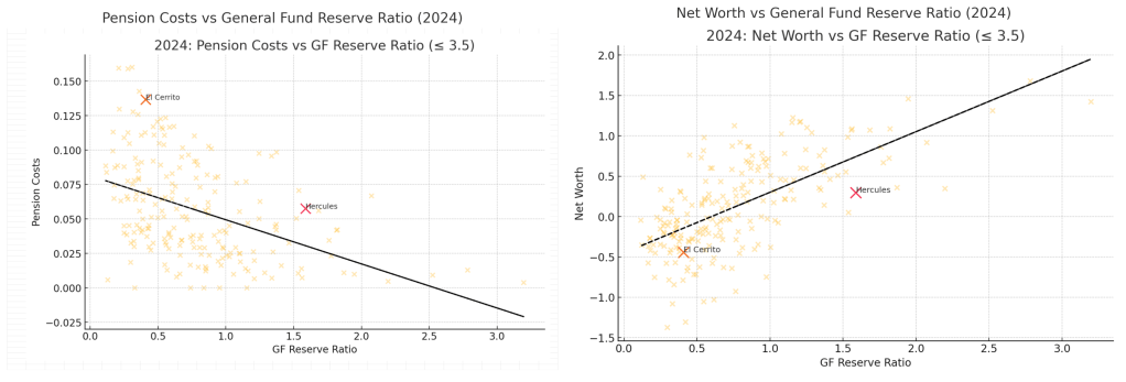 El Cerrito is a stark outlier—saddled with high pension costs and among the lowest General Fund reserve ratios in the state. Compare this with a city of similar size and population, Hercules, which maintains moderate pension costs and a much healthier reserve position. The trendline is clear: higher reserves are associated with more manageable pension costs. El Cerrito breaks this trend in the worst way possible.