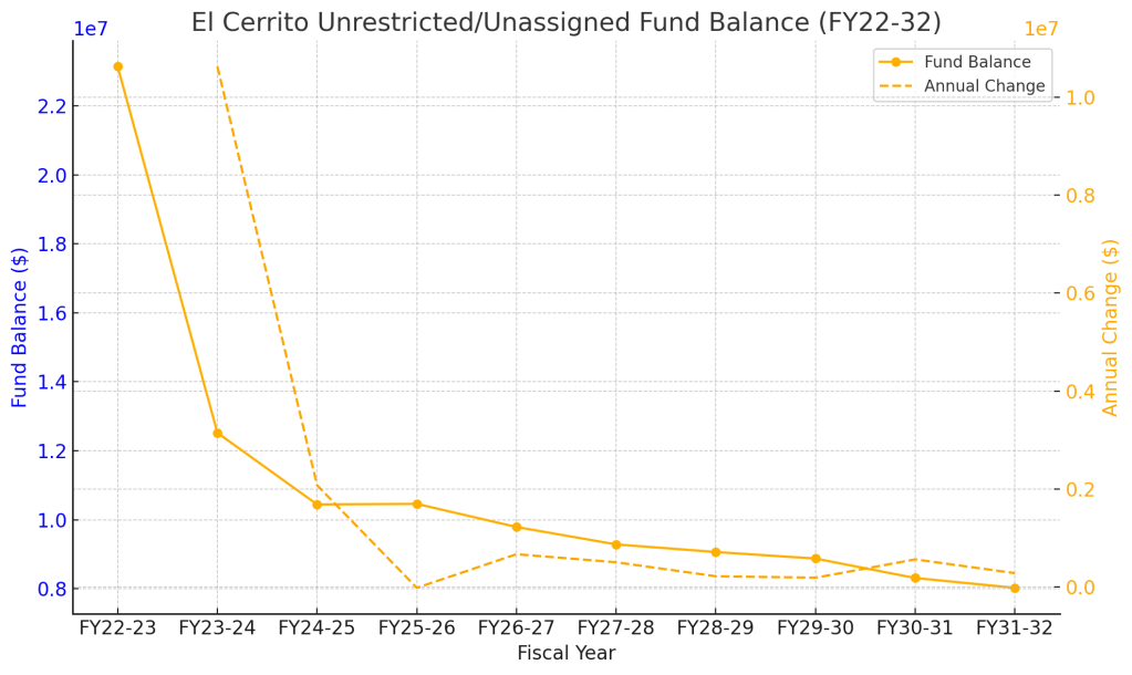 At its June 17, 2025 meeting, the El Cerrito City Council is scheduled to adopt the FY 2025–26 budget. While the proposed budget is presented as balanced, it includes a planned $2.3 million reduction in the City’s unrestricted General Fund balance to close a projected operating shortfall—continuing a troubling trend of using one-time reserves to fund recurring expenses.