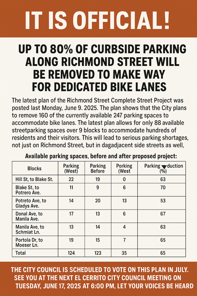 The City of El Cerrito has released the updated Richmond Street Complete Street Project plan—dated Monday, June 9, 2025—and the implications for neighborhood parking are serious.