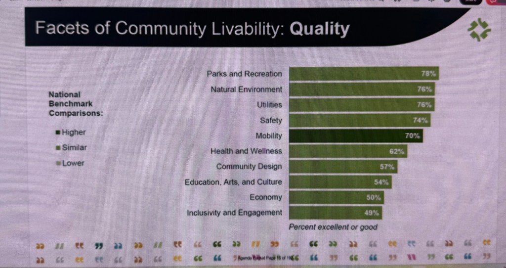 There will likely be high-fives, back-patting, and reassuring statements about progress — particularly around the City’s summary of the 2025 National Community Survey (NCS), which shows an increase in overall confidence in City government.