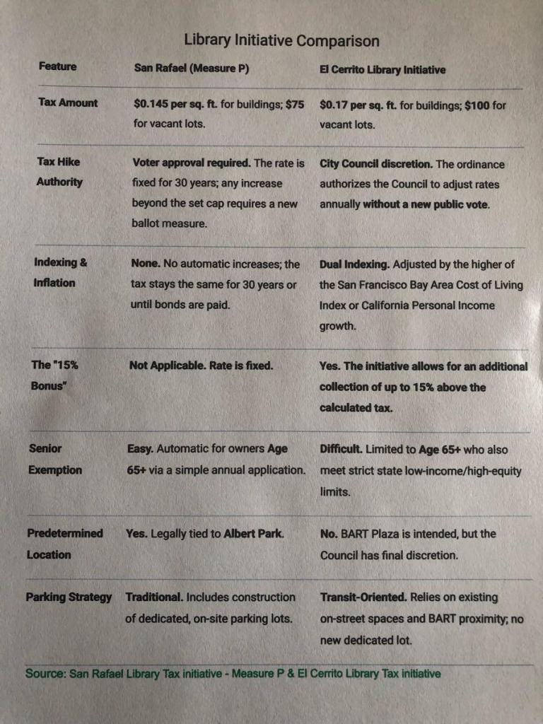 A concerned neighbor created this Library Tax Comparison after learning that the El Cerrito Library Tax language was modeled on San Rafael’s Measure P.