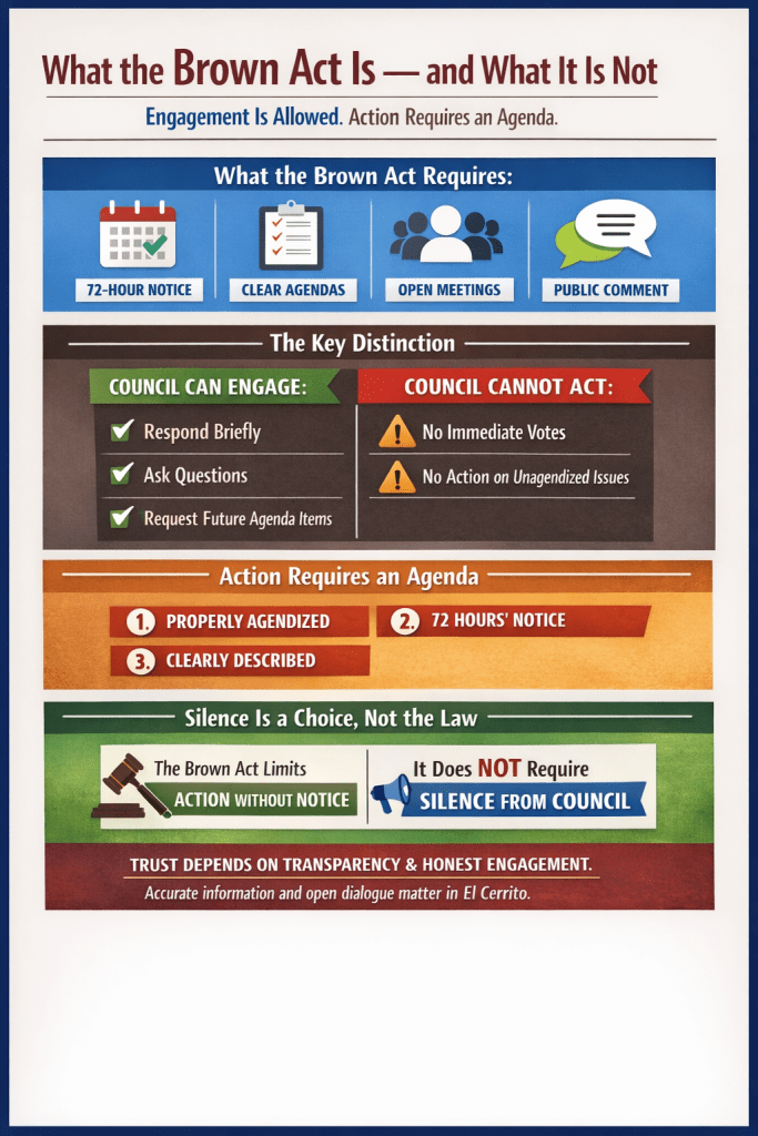When residents receive no acknowledgment — and are told “the Brown Act prevents us from responding” — it creates unnecessary confusion.
