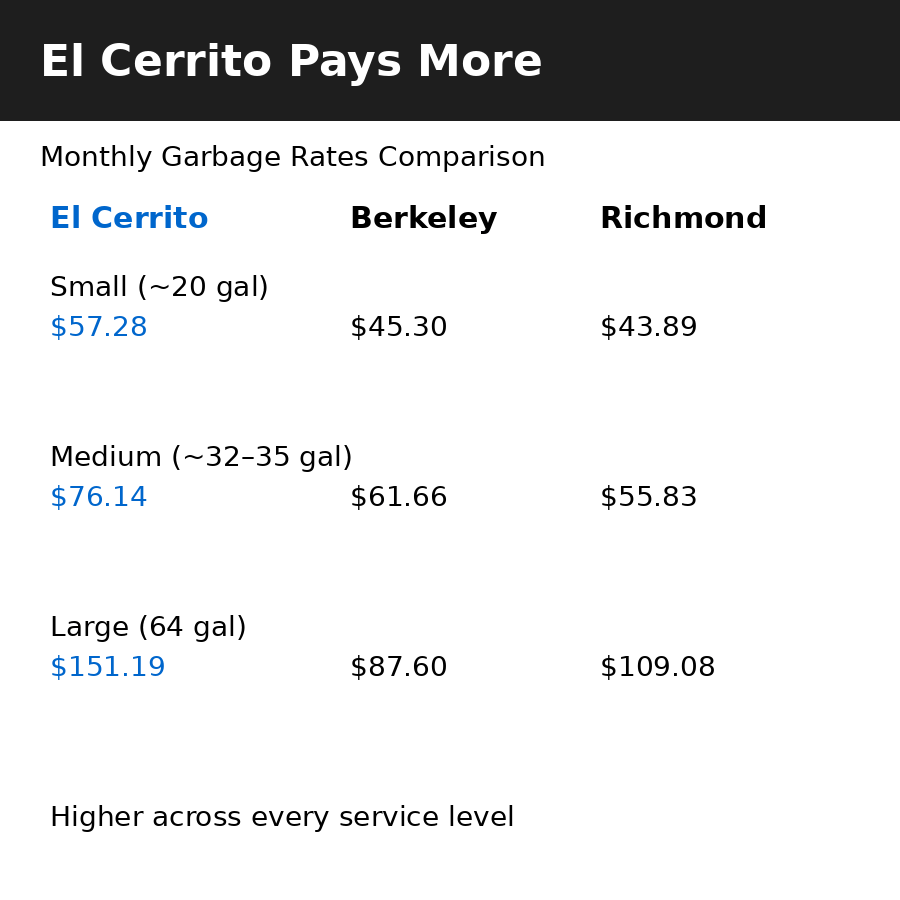 El Cerrito’s solid waste rates already appear higher than neighboring jurisdictions. Yet there has been no recent competitive process to demonstrate that residents are receiving the best value.
