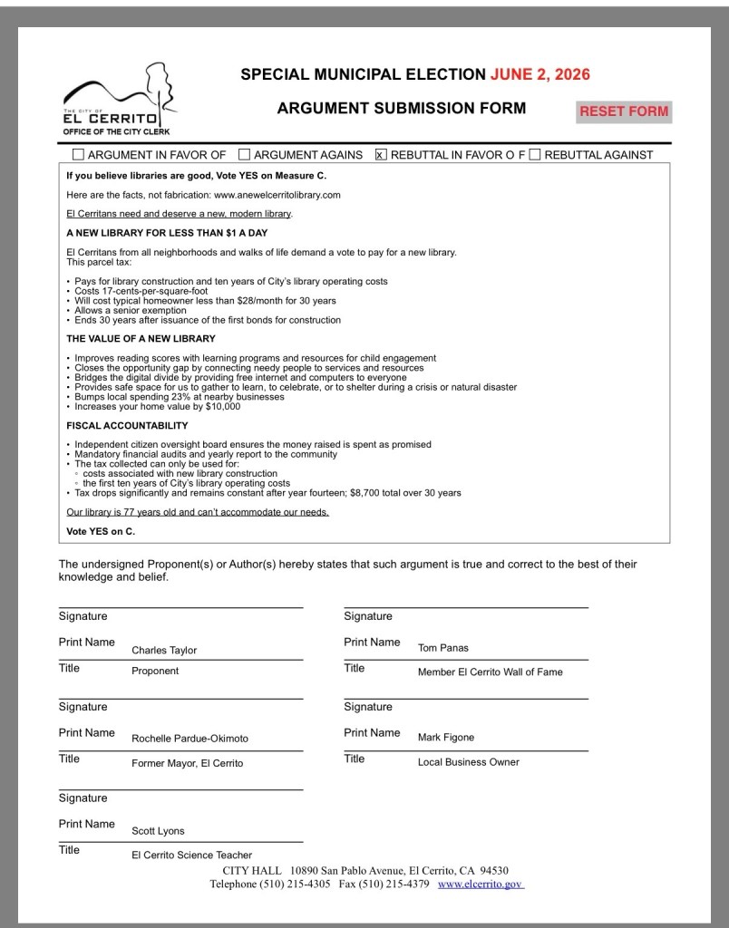 This is not about whether libraries are valuable. They are. The question before voters is whether this specific proposal—with its structure, cost, and long-term implications—is the right approach for El Cerrito at this moment.