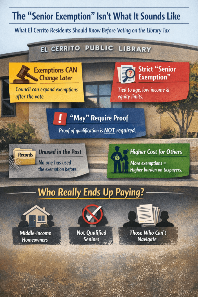 Tonight, the El Cerrito City Council will hold a study session on exemptions related to the proposed library parcel tax (Measure C). On the surface, this sounds reassuring—especially for seniors. But when you read the details in the agenda packet (pages 75–84), a more complicated picture begins to emerge.