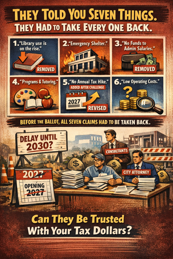 At a February 2023 City Council meeting, residents were told a new library could open as early as 2027. By May 2025, that estimate had shifted to 2030. That is a three-year delay before construction has even begun—and before voters have approved funding.