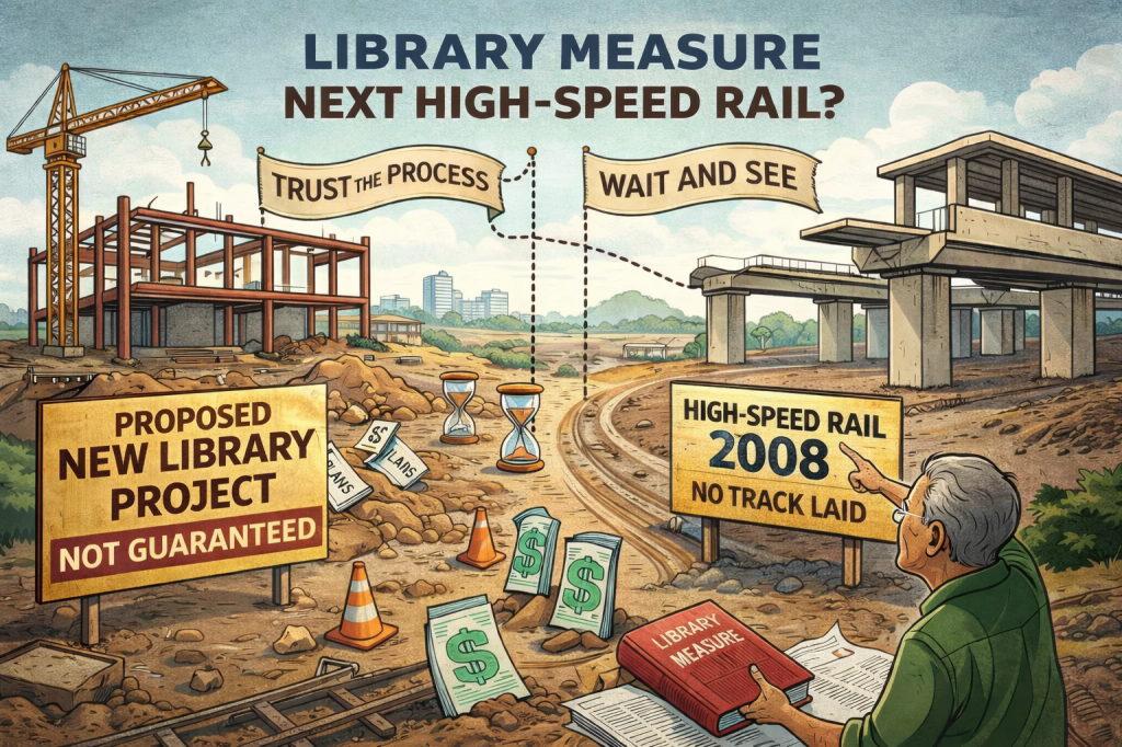 El Cerrito residents are being asked to approve a library measure that, on its surface, feels familiar: invest now, build later, trust the process. But when you take a closer look at how the measure is structured, it begins to resemble something Californians know all too well—the high-speed rail project.