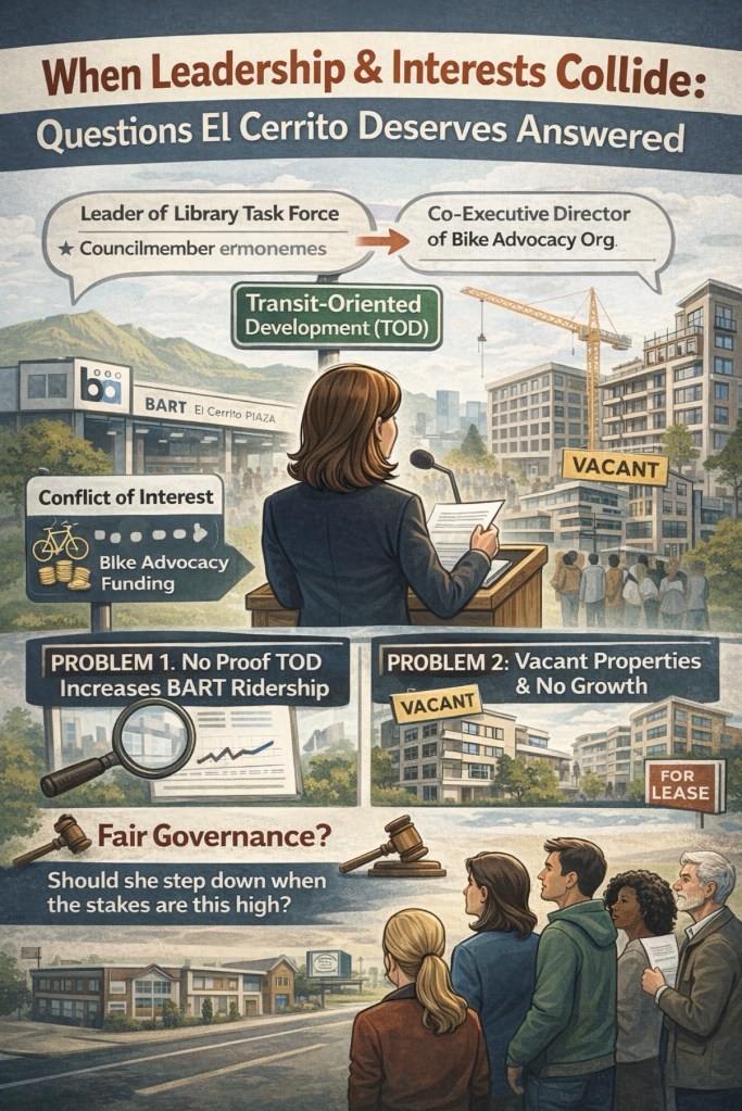The City of El Cerrito recently established a new library task force to assess potential sites following community concerns that the City Council had already made its decision to place a new library at the El Cerrito Plaza BART location. This shift did not happen in a vacuum. It was influenced in part by ongoing social media conversations where residents raised concerns, shared information, and challenged the narrative around both the location and the process. Councilmember Rebecca Saltzman was selected to lead this effort. At first glance, this may seem like a reasonable step forward, but when you look more closely, serious questions emerge—questions that go beyond process and speak directly to public trust. Ms. Saltzman currently serves as Co-Executive Director of Bike East Bay, an organization that is receiving funding tied to the broader BART development efforts, including the El Cerrito Plaza site. This creates a situation where decisions related to the project could directly benefit an organization she leads.