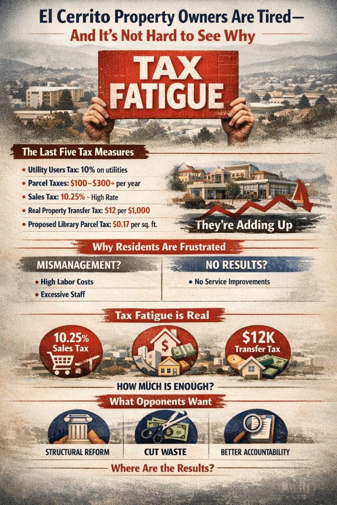 El Cerrito voters are once again being asked to open their wallets. But this moment doesn’t exist in isolation. It sits on top of years of tax measures, rising costs, and growing concern that the City’s financial challenges aren’t being fixed—just funded. For many property owners, this isn’t about a single ballot measure anymore. It’s about fatigue.