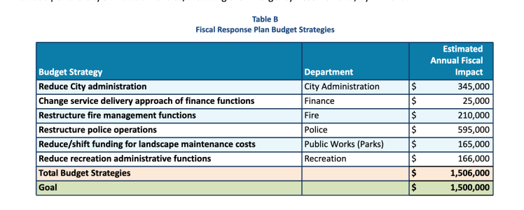 “Instead of implementing this level of reductions during this fiscal year, City staff strongly recommends that the City Council seek to consider long-term, structural reductions that would take effect in the next fiscal year budget. The City Council will be provided with additional information at the upcoming City Council meetings that will better inform the Council and the public, including a presentation on the City’s CalPERS pension liability and discussion of the five-year budget forecast in March. City staff further recommends that a community meeting be held following these presentations so that the public can provide feedback to the City Council on the budget. While it is true that additional reductions result in achieving our General Fund Balance goals more quickly, the results of a reduction in the amount of $1 million in the final four months of this fiscal year will have severe impacts. Staff recommends a strategic approach that continues the progress that has been attained thus far, maintains the Fiscal Response Plan, and allows the City to achieve our goals in a way that still provides an adequate level of services to our residents and businesses.”