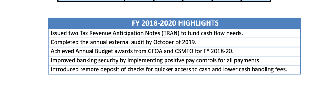 1. On page 10 (all page numbers correspond to the pdf page number) it states that city management began to tackle financial issues in 2020. This made me laugh since 2017 the auditors have told the city there has been an issue with the concept of the city continuing as a going concern. So they are admitting it took three years to address that.