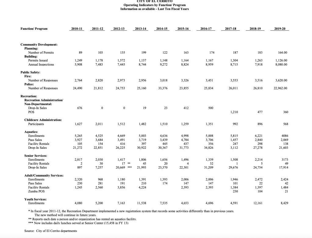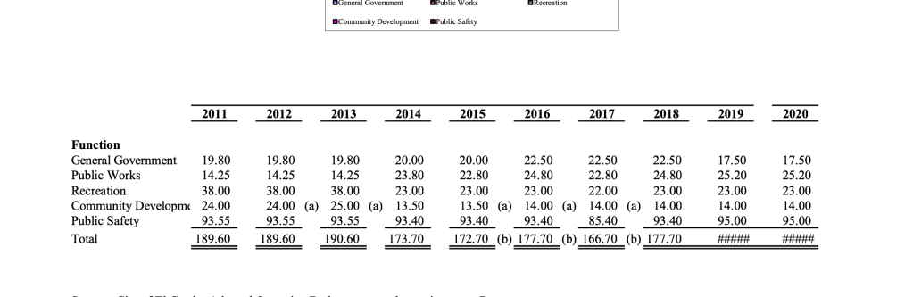 4. On the chart for El Cerrito Full-Time Equivalent City Government Employees by Function Last Ten Fiscal Years on-page 160, it shows only 3 fewer staff people in the last two years. I do know that some additional layoffs happened in January 2021 but 3 is not a lot of people. Not sure why the totals are xx’d out but I added and it was 154.7 for 2019 and 2020.