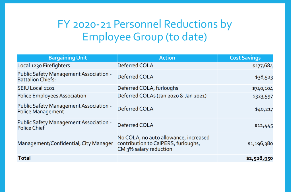 The negotiators Councilperson Quinto and Mayor Lyman have not asked the City Manager to make any real concessions as the city falls into bankruptcy. Her contract is revised to keep her increased contribution of 3% to Cal-Pers which was implemented this year. It continues to not offer the car allowance, which is something that Councilperson Fadelli has stated numerous times he would fight ever returning. It does not give her a COLA UNLESS other non-represented management staff receive a COLA. It does roll back the 3% COLA she got in 2019 when the city was already in financial dire straits.