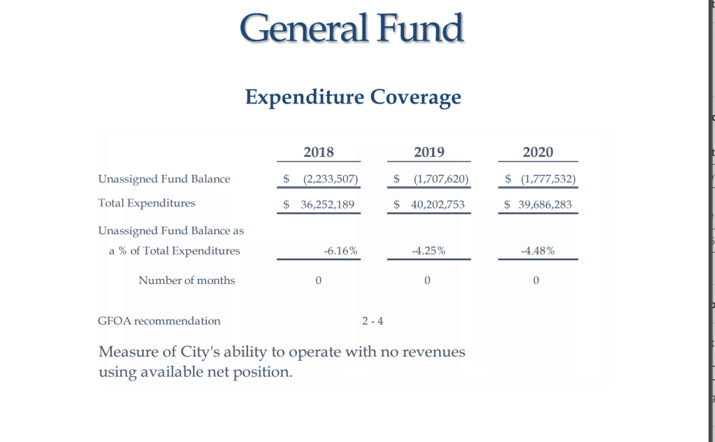 Below is from the auditor’s report. Note the negative $1,777,532 unassigned fund balance. Notice the lack of reserves from last year and the recommendation of 2-4 months of cash on hand.