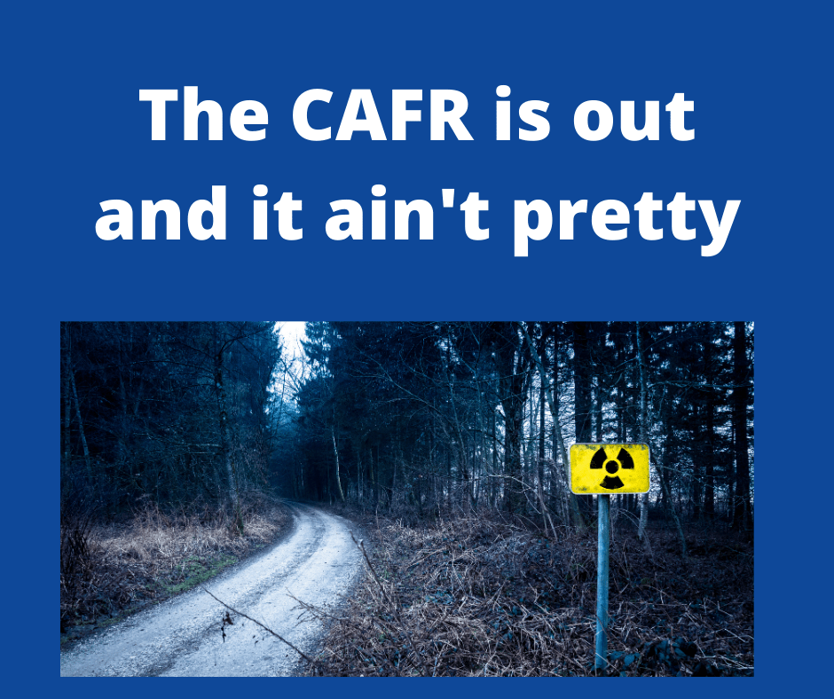 Next Tuesday is the next council meeting and both the CAFR and 1 million dollars in proposed cuts will be on the agenda. This is a must-attend meeting!