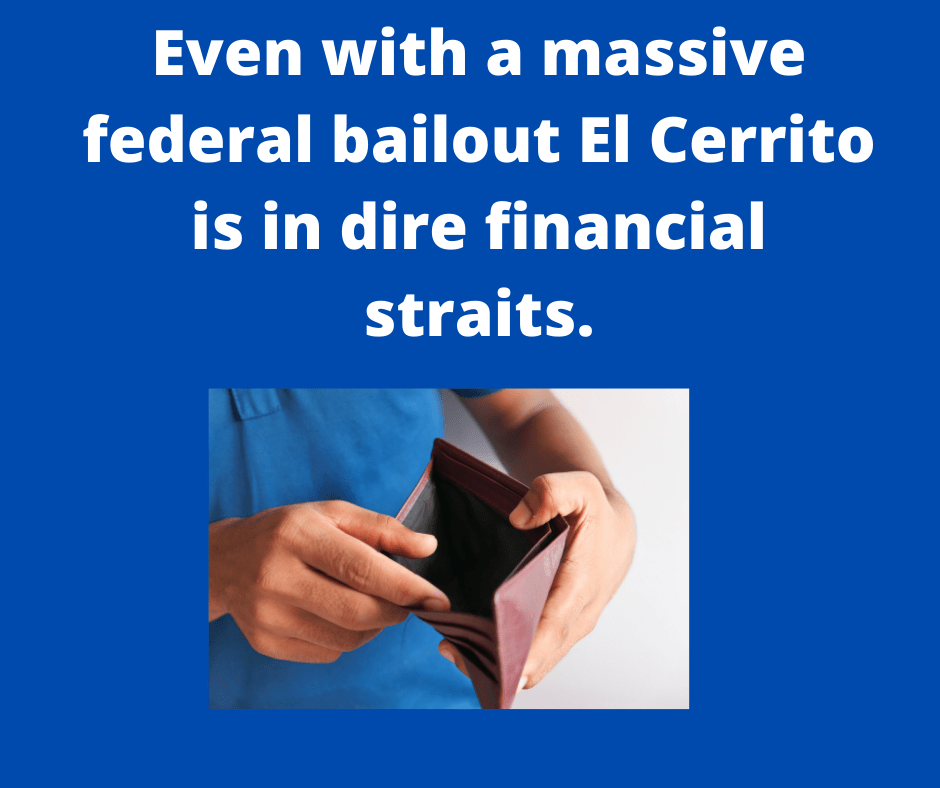 The good news is that El Cerrito is going to receive 4.8 million dollars in a federal bailout. The prediction is that it will come half this year and half next year. And as of this time, it appears the only restriction on spending is you cannot pay down pensions. I have heard several council members intimate that this bailout was going to save us. And on some level, I suspect it will. But staff did a five-year projection. And it appears that they are recommending two million in structural cuts for next year. Remember when I posted about the City Manager’s suggestions for scorched earth cuts? The ones the Council immediately said no way to. That is the level of cuts we are talking about.
