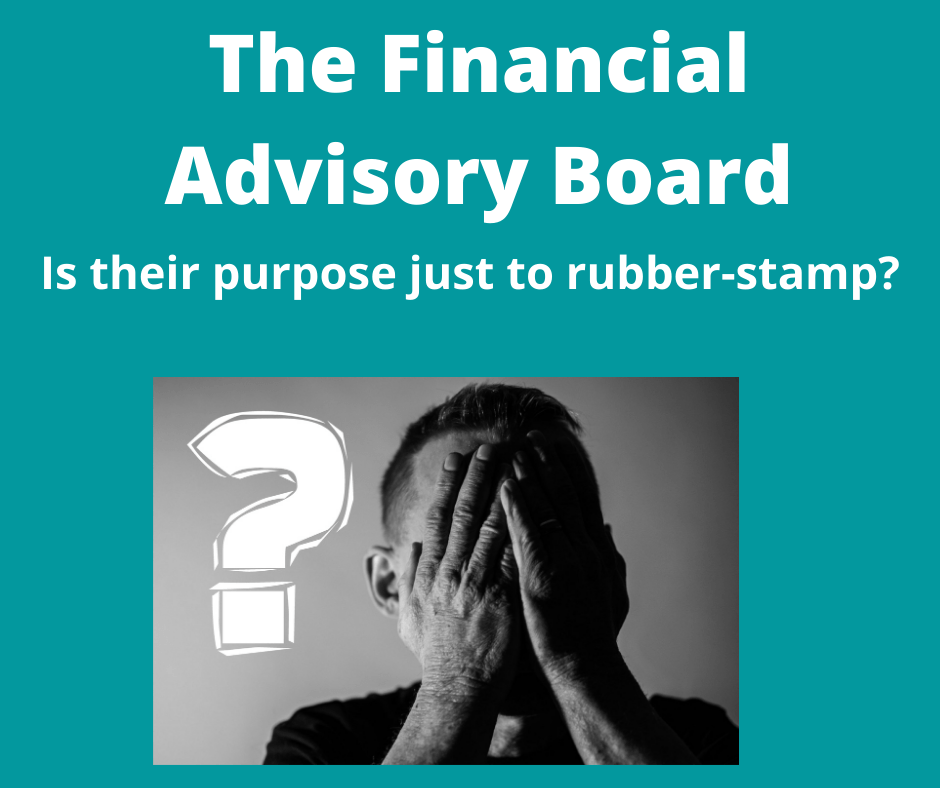 Both the Chair Dick Patterson and the Finance Director were pretty clear that the purpose of the FAB is to rubber-stamp what comes from staff. FAB Member William Ktsanes has been requesting additional information from the Finance Director and not getting the level of information he wished for. The Finance Director said that the staff did not have the time to prepare them and the Chair Dick Patterson said that many on the board did not have time to dig in deeper. It was very disappointing.