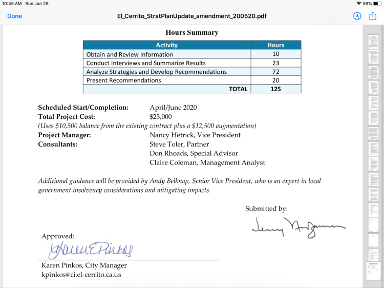 Once again the staff and council are not taking aggressive enough actions. Last meeting Council members Pardue-Okimoto and Quinto both pushed for more cuts but NO ACTION was taken. I beg those council members to push harder next meeting and hopefully, a third council member will have the guts to agree. This budget should not be approved without an additional 10% in cuts. The police department seems to have some low hanging fruit. The administrative staff is only committed to furloughs through the end of the calendar year so that would save 300k more if extended through the FY. We should be aiming for a surplus more in the 2 million range so we have room for emergencies and we can take a big piece out of the TRAN for next year. Because remember our bond rating dropped and that loan (if we get it) will cost the city even more than the 100+K it cost this year.