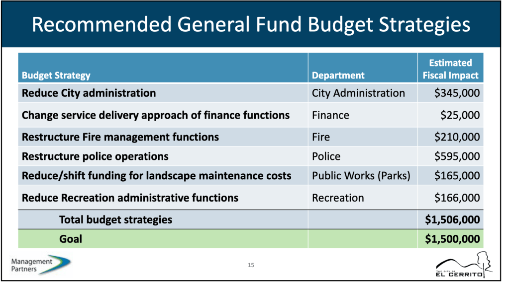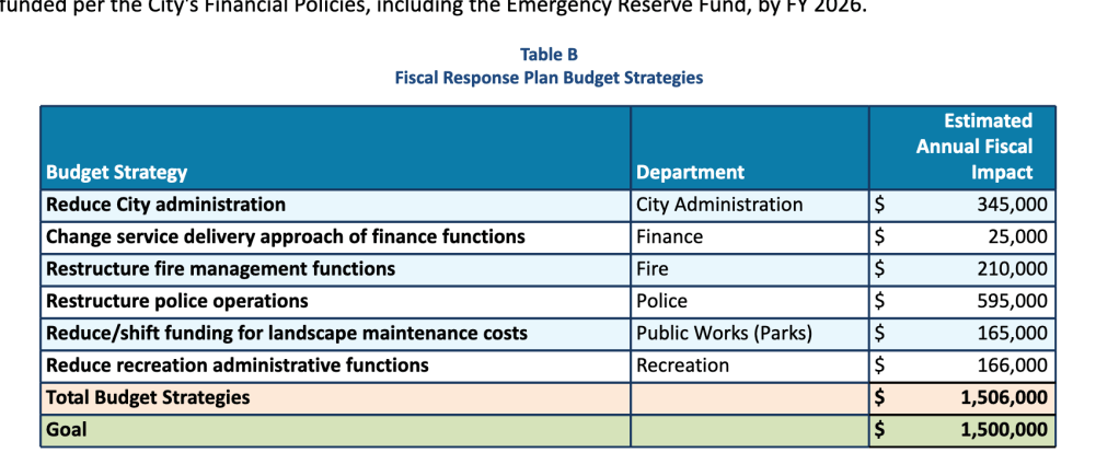 “Budget Strategies To address the fiscal gap in this recessionary environment and to restore General Fund reserves to the minimum recommended reserve goal of two months (17%) of annual operating expenditures, the City is implementing budget strategies of $1.5 million in annual budget savings. These reductions are beyond the actions the City included within the preliminary FY 2020-21 budget. This action will restore General Fund reserves above zero by FY 2022-23 and to the minimum recommended reserve goal of 17% by FY 2025-26, as shown in Charts 2-5 and 2-6.”