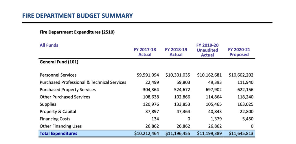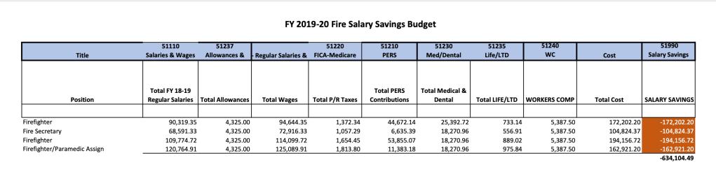 “For the first time in over a decade, the Fire Department will be fully staffed operationally beginning in January 2021. The Department will not rely on overtime from the three unfilled authorized “coverage” positions as in years past, resulting in approximately $400,000 savings in overtime costs. Fire Department overtime (non-OES), which has exceeded a million dollars in each of the past three years, is budgeted at $500,000 and will be contained at this level once the three vacant positions are filled.”