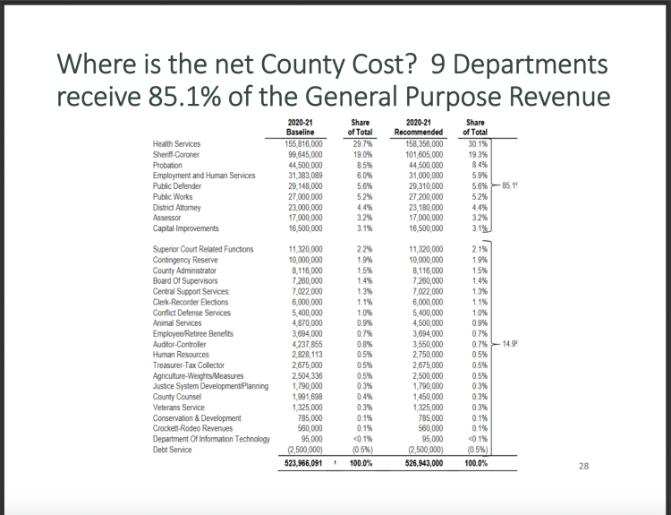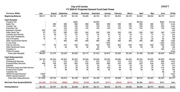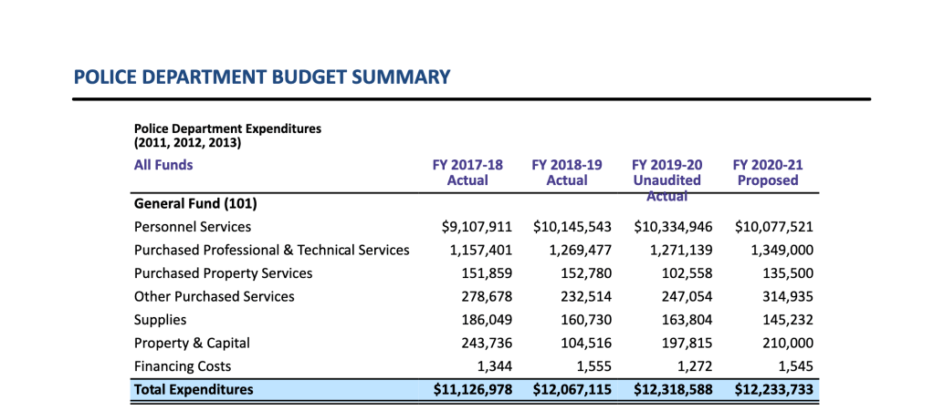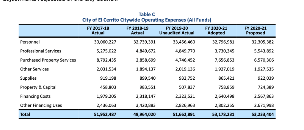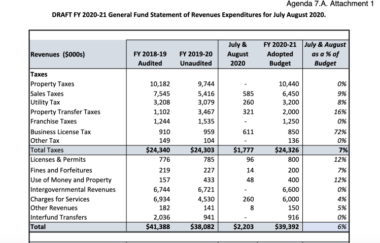 “With these adjustments staff is proposing a General Fund Budget of $39.3 million in revenues and $38.7 million in expenses for FY 2020-21. This represents a $3.4 million (or 8%) reduction in revenues and $3.9 million (or 9%) reduction in expenditures over the baseline budget.”