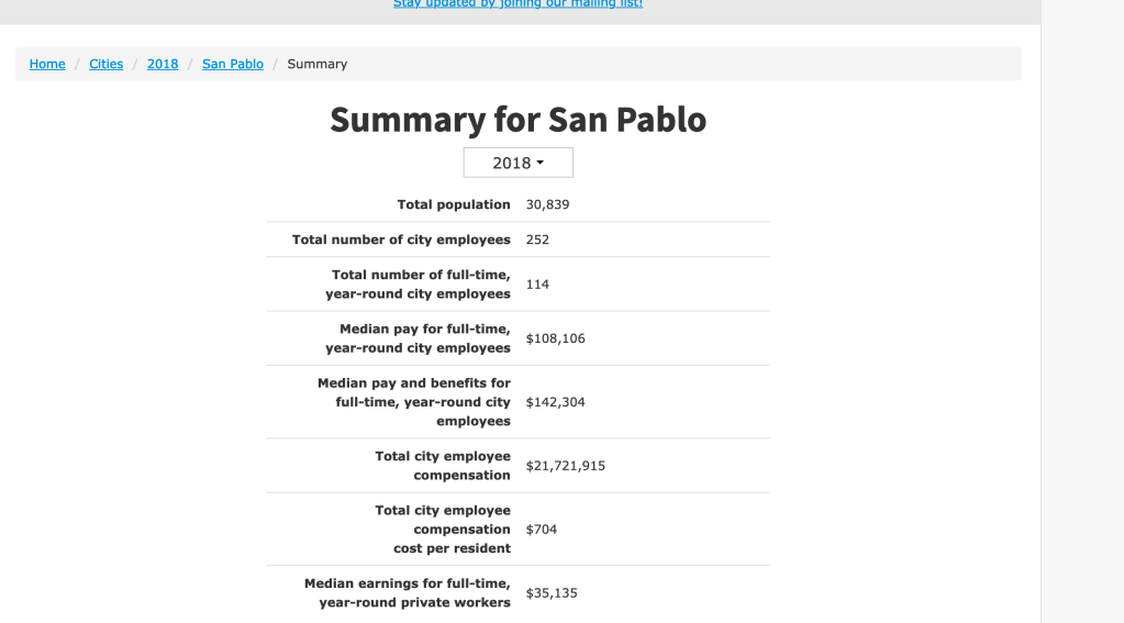 Our city has 25k residents and 384 city employees of which 159 are full time. The cost per resident is $1,163, which is $328 per resident more than the next closest city of Albany. Our city has 132 more employees than San Pablo which has 5k more residents.